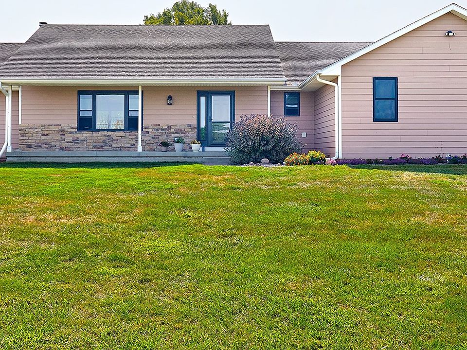 Beautiful custom ranch on 8 acres, less than 10 minutes from Indianola. The main floor feels inviting with a vaulted living room, stone fireplace, open kitchen with island seating, and dining area with deck access. Spacious master suite features a soaking tub, dual sinks, and oversized walk-in closet. Two additional bedrooms and full bath complete the main floor along with laundry and drop zone off the 3-car garage. Walkout lower level offers a huge family room, storage, 4th bedroom with bath, and patio with firepit. Impressive 40’x56’ outbuilding with electricity, concrete and oversized doors is ideal for RV, camper, or hobbies. Plenty of space to enjoy country living close to town!