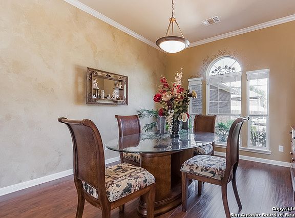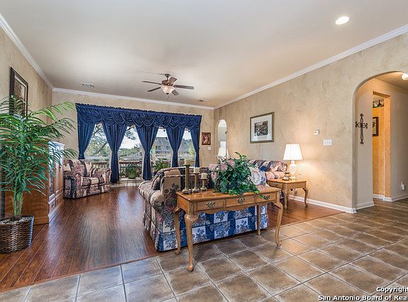 Single Family Detached - Helotes, TX Stunning 1 story home with 2 story views! Beautiful inside & out. Wood laminate & tile thru-out:no carpet! Inviting open floorplan. Gas fireplace. Granite counters,tons of 42" cabinets, 3 ovens, tumbled marble backsplash, under cabinet lighting, walk-in pantry. Custom blinds, updated fixtures. Private master suite w/ sitting room, garden tub & XL closet. Que Box. Gutters & Sprinkler system. 2 decks off the back + covered patio w/fire pit. Hot tub. 3 car garage. New reasons to "ooh & ahh" at every turn.