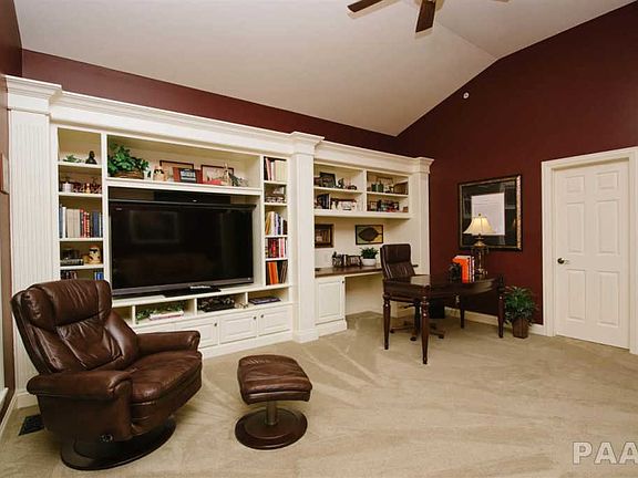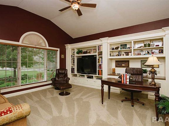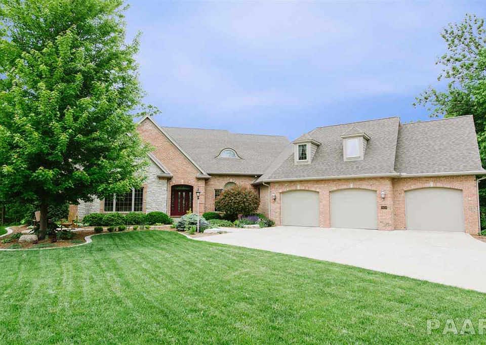 Presented by Kepple Real Estate Group (309) 282-7373: This gorgeous brick home with over six acres is nestled back on a quiet culdesac encased in colorful landscaping. With luxurious details like twelve foot ceilings, Brazilian cherry floors, custom built-ins and French doors with transoms, this home offers great space paired with quality construction. The large kitchen features Merrilat cabinetry and granite with an open layout to the informal dining area for easy entertaining. The master suite is one of a kind with sunken tub, stall shower, sauna, and huge walk-in closet. Enjoy the peaceful and private wooded setting on the raised back deck.