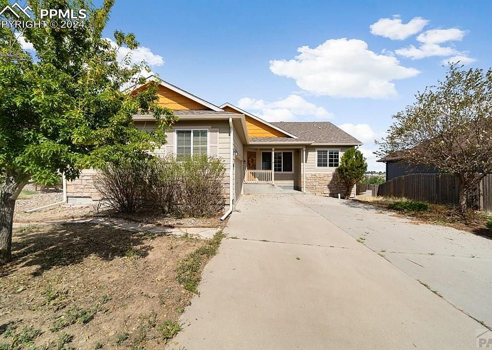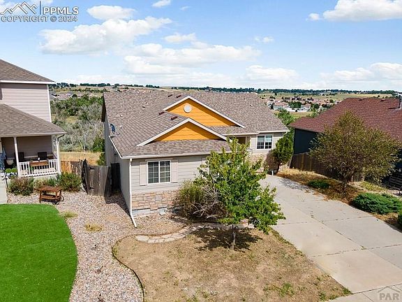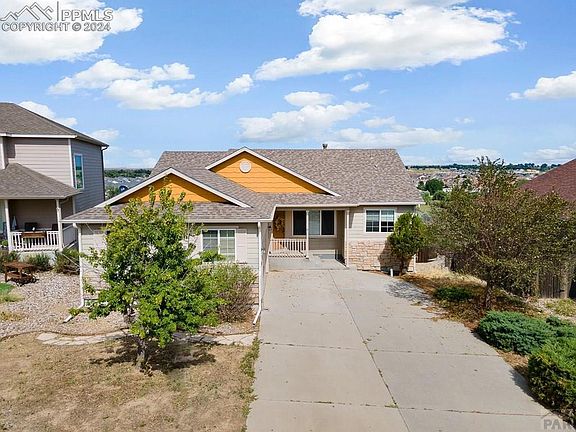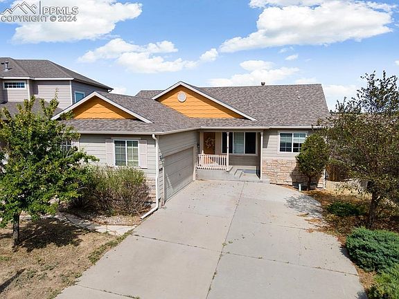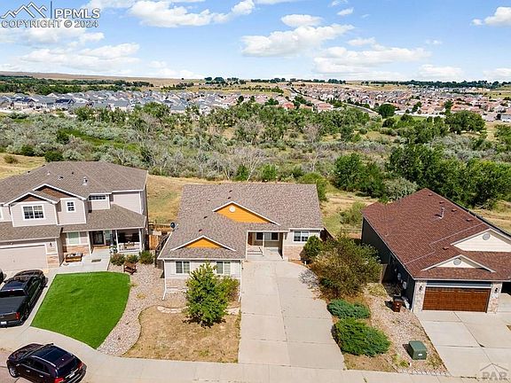 Welcome to this ranch-style home featuring a spacious open floor plan on the main level, seamlessly connecting the kitchen, dining room, and living room. The kitchen boasts beautiful cabinets, a large sink, and large breakfast bar. The dining area and living room share a double sided gas fireplace for cold winter nights and sliding door off the kitchen/dining room conveniently opens to a large wooden deck, offering picturesque views of the open space and neighboring areas . The primary suite shares these views and includes an en-suite bathroom with a walk in shower large walk in closet and double vanity. Two additional bedrooms, another full bathroom, and an oversized laundry room just off the master with folding counter and plenty of room for built in pantry/storage completes the main level. This home has Central AC for the warm Colorado Summers and a gas double sided fireplace to keep you cozy through the winters. The partially finished walkout basement offers ample potential for customization. Conveniently located near Fort Carson, shopping, dining, and other amenities, this home provides both comfort and convenience.