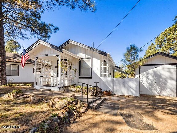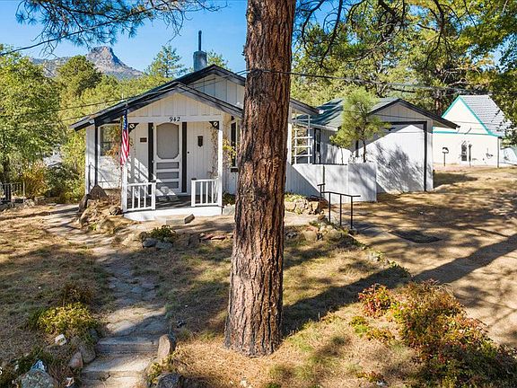 Set away on an historic quaint street in Prescott, this home is on the National Registry of Historic Places. A gorgeous setting with pine trees and boulders, this property has lots of possible uses. Over the years, the house has undergone renovations while retaining the character typical of older homes in Prescott. The inclusion of granite kitchen counters adds a modern touch while preserving the traditional style. The picturesque view of Thumb Butte is captured from the main level bedroom, but also from the expansive deck at the rear of the house. An additional highlight is the sizable .41-acre property, which holds potential for division into two parcels. With secondary access from Sharlot Avenue, this property offers versatility in terms of potential use or development. Built in 1914