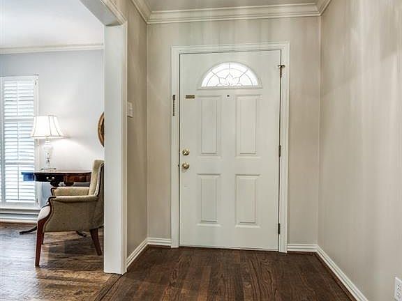 Beautiful Richardson Heights home on a private street with a gorgeous setting and a large 75 x 154 lot. Fresh paint, hand-scraped hardwoods, crown molding, open kitchen and an updated hall bath. The kitchen is open to the den and features painted white cabinets, granite, stainless steel appliances and a pantry. The inviting den has vaulted ceilings, a red brick wood-burning fireplace with a gas starter and French doors that lead to the back yard. The formal living and dining area has a custom and built-in book shelf and looks onto the covered front porch. The backyard is huge! It has a 19 x 10 covered patio and a very large grass area. This stunning and one of a kind property can be yours today!