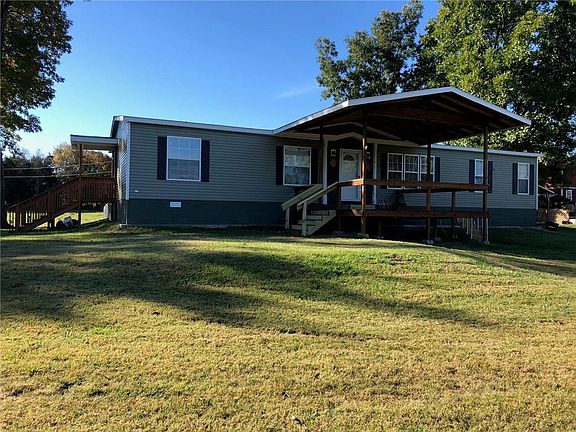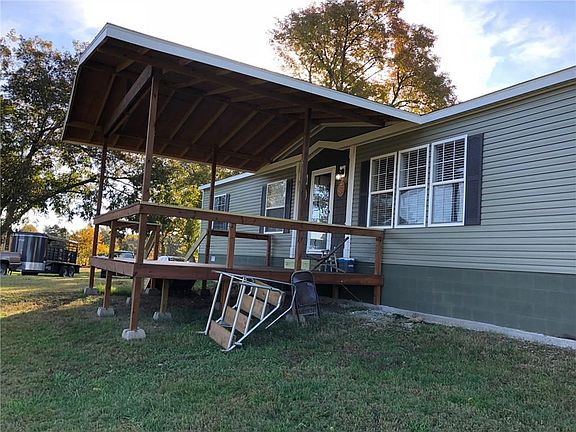 This beautiful property has a very nice 2 year old double wide on approximately 15.32 acres. Pasture is fenced for cattle or horses, 2 ponds, chicken coop. The home is on permanent foundation concrete slab to blocks. 2x6 walls. Open kitchen-living room, wood burning fireplace. 3 bedroom, 1 bath on one end of house with the master on the other. The front of the house has a large covered deck made with composite decking.