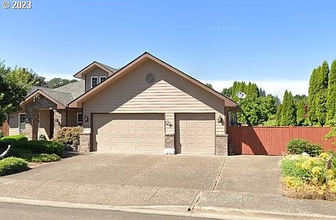 Beautiful open one level home, tucked at the edge of the cul-de-sac in a desirable and quiet neighborhood. Primary bedroom plus a suite for guests, extended family or caregiver. Enter the large family room through glass french doors, offering a wet bar. 3 car garage. Low maintenance yard with mature landscaping, back deck, sprinklers and alarm system. Hardi-plank siding, close to the Willamette River, park and bike path.