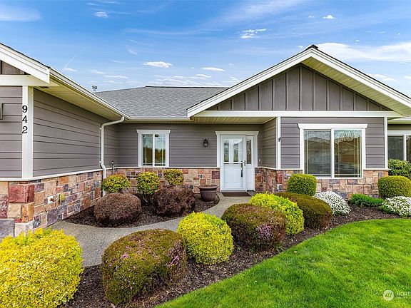 Immaculate one-level living in Pepin Creek's 55+ community. This light & bright home boasts a zero-threshold entry, private office, 3 bedrooms, & open-concept design. Home features granite counters, tile backsplash, & island with raised eating bar, gas fireplace, built-in entertainment center, vaulted ceiling, central vacuum & AC. Primary en-suite offers a private bath with walk-in tile shower and soaking tub. Guest suite with walk-in shower. Private backyard & back patio for outdoor relaxation and extra-deep 2-car garage with shop area. New LG appliances and carpet. Accessibility features include 36" doorways, hand bars, and easy-access showers. Quality craftsmanship and room for hobbies. Welcome home to comfort and convenience!