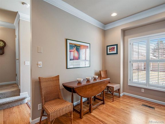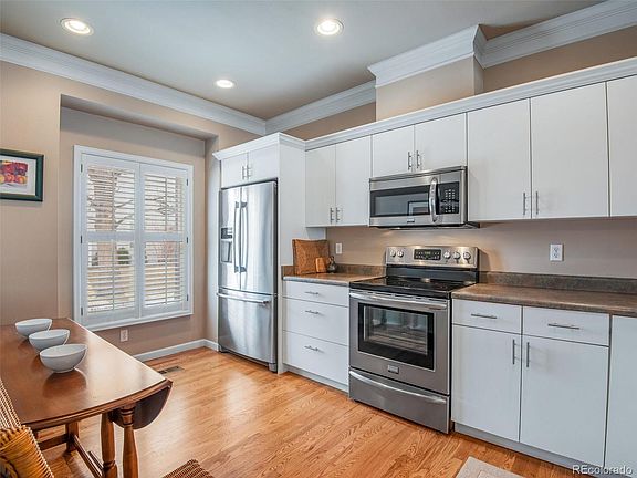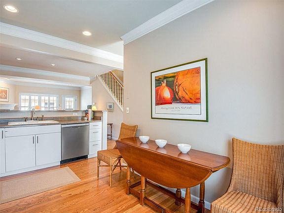 Sophisticated south-facing townhome tucked away on a quiet tree-lined walkway located just steps from Mayfair Park, this home offers the perfect relaxed Colorado lifestyle. This 3 bedroom, 3.5 bath home combines great flow, custom window treatments, crown molding and rich oak hardwood floors. The main level has an eat-in kitchen with stainless steel appliances and a sun-filled living room with gas fireplace adjoining a private outdoor courtyard. The second level has two sizable bedrooms with en suite baths including the primary bedroom with large walk-in closet and dual sinks. The lower level has two large storage areas, and an additional bedroom and bathroom – perfect for guests or home office. Detached 2-car garage. Close to Cherry Creek and blocks from shopping and dining, you’ll find unique restaurants, boutiques and chic gathering spots lending a cosmopolitan feel to this exceptional Mayfair