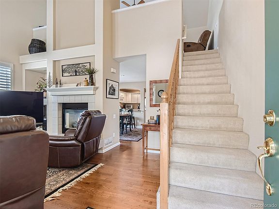 One of a kind end unit townhouse with views of the Rocky Mountains! As you walk in the front door you are greeted by vaulted ceilings in the living room with a two sided gas fireplace, hardwood floors, plantation shutters, and lots of natural light. The stairs lead to a loft that makes a great office, playroom, or workout space. The main level has a dining room that opens to a large deck overlooking a park, trails, and mountain views! The eat-in kitchen is a chef's dream with plenty of counter top space for meal prep, pantry, and tons of pull out cabinets for storage. The western view will never get old! Main level primary suite with two closets and a 3/4 bathroom. There is also a secondary bedroom on the main level that is close to a full bathroom. The basement has a flex room, bedroom, 3/4 bathroom, good sized laundry room, and access to the garage. You can walk out the door and step onto the park trails! Quick access to local shops, grocery stores, community centers, and highway 470. This home has been well cared for and it is move-in ready with new carpet, newer HVAC units and water heater, and newer roof. Move in and enjoy!