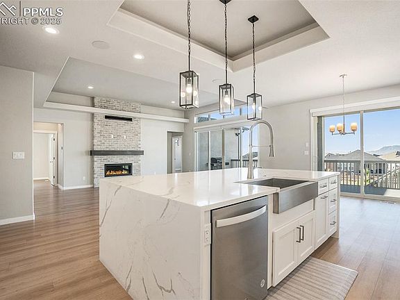 Sleek linear fireplaceBreathtaking mountain viewsSpa-inspired bathCraftsman trimDesigner tileworkOversized waterfall-edge islandQuartz counters