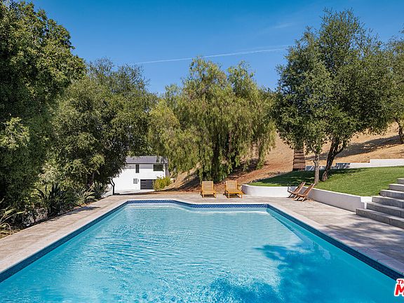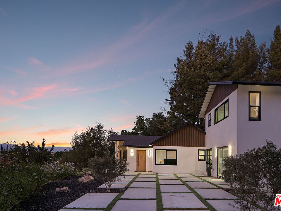 From the moment the automated gates open, The Sky Estate at 9425 Gierson feels less like a residence and more like a private retreat in the clouds. A sculpted drive winds past a detached four car garage and curated California modern landscaping of olive and willow trees, specimen succulents, and native cacti. As you ascend the ridge, the city fades away and the horizon opens wide. Inside, a dramatic living room with 12-foot ceilings and floor to ceiling glass frames panoramic mountain and valley vistas turning every sunset into part of the decor. Wide plank oak floors lead into an open dining area and chef's kitchen with Italian cabinetry, a quartz waterfall island, and a complete Thermador suite, designed for effortless entertaining and everyday comfort. The main level also offers a junior en-suite for guests or multigenerational living, a powder bath, mudroom, laundry, and a lounge with canyon views. Floating Brazilian stairs rise to two secondary bedrooms and a breathtaking primary suite, where mornings begin with sunrise over the ridgeline. The spa inspired bath showcases a freestanding tub, dual rain showers, and custom wardrobe storage. Outdoors, the estate unfolds like a hillside resort: a pool with built-in BBQ, a putting green, and a sky-deck with firepit capturing 270-degree city-light views. With nearly two acres of LARA-zoned land, the property also carries rare equestrian-friendly allowances an uncommon advantage in Los Angeles that expands the lifestyle possibilities of this private sanctuary. Thoughtfully engineered with dual-zone HVAC, tankless water heater, 400-amp service, EV charging, and Low-E glazing, The Sky Estate offers architectural presence, modern luxury, and a sense of escape ready to welcome its next chapter.