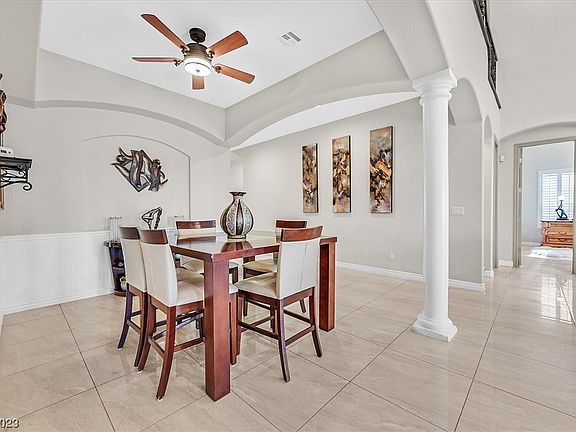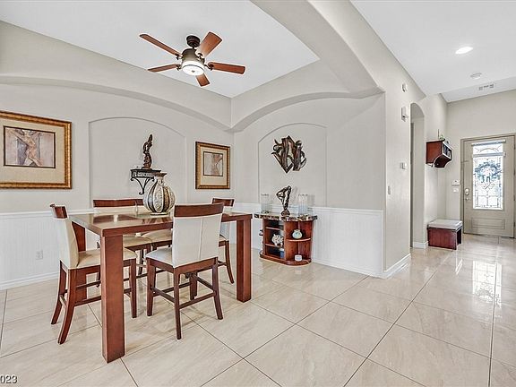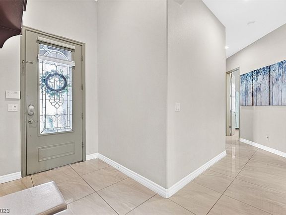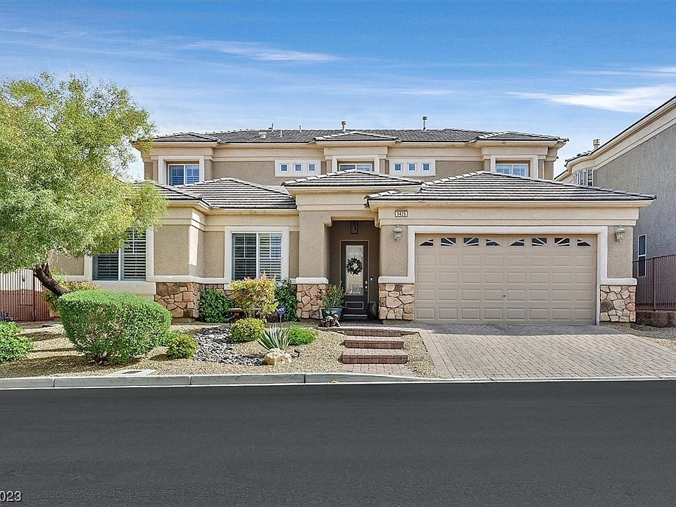 2 story 3265 sq ft gorgeous home in a gated community. It feels like a 1 story home, but has a large loft and a bed and bath upstairs. There is a 3-car garage with one of them being a tandem garage and hanging racks stay. The front and backyard were professionally landscaped, backyard has a soothing water feature, cement table and benches that are included. No houses behind you for privacy. Check out the beautiful kitchen with granite countertop and stainless appliances. This a very open floorplan with a giant loft for entertaining and the seller will leave the pool table at no extra charge. The primary bedroom is downstairs in the back. The other downstairs bedrooms are in the front of the house. The whole downstairs has 24" tile floors. The upstairs loft and bedroom has carpet. This house comes with fully paid off solar panels ( only $13 per month paid to Nevada Power). There is a radiant barrier in the attic to help on the A/C as well as replacing 2 of the 3 A/C units.