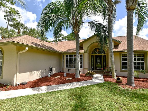 Tropical paradise in Jupiter Farms! This 3BR / 2BA / 2Car Garage pool home sits on 1.25 private fenced acres, loaded with palm trees. With a large screen enclosed patio area, plus additional un-screened patio area with a free form pool and a gazebo w/power for a spa, you can decide how to enjoy the Florida lifestyle! Open floor plan with vaulted ceilings and skylights, Kitchen has stainless appliances with pantry, granite counters throughout, separate Dining Room, Murphy bed & built-in desk in Bedroom 3, new roof in 2018, on a paved road near Riverbend park!