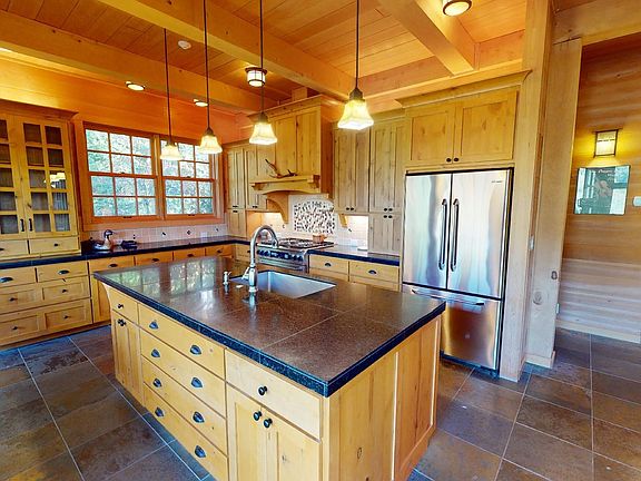 Elk Riverfront craftsman styled home is perfect for those who love spending time outdoors. 2BR/2BA main home & 1BR/1BA guest quarters. Oversized windows to allow light and the river view in, this home was constructed of Port Orford Cedar-known for its durability. Gourmet kitchen w/ Alder Cabinetry, 6 Burner Dacor stove, Island with sink/dishwasher & ample storage. High ceilings and a charming fireplace. Plenty of room for all your outdoor toys w/ 3 garages- one large/deep enough for your boat.