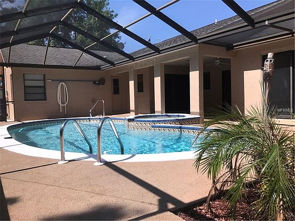 Large 3 bedroom, 2 bath, Pool home with additional office/4th bedroom. Great layout and use of space in this contemporary, Florida style home. Separate living and Family rooms. Access to hall bath from pool area. Master has large sunken tub and double sinks. All bedrooms are equipped with large walk-in closets. Heated Pool and spill-over spa are screened as well as the covered area for outside enjoyment. There is an additional room off of the garage that can be used as a den, office, man-cave or additional bedroom. Large 2-car garage with washer, dryer and utility sink. Roof 2000, A/C 2016.