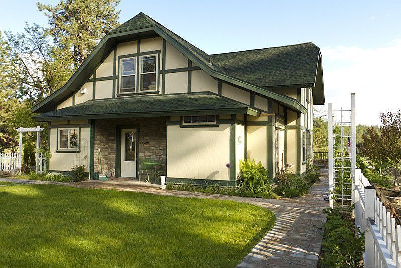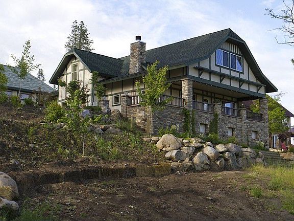 This magnificent 2-story Tudor is set in the cozy town of Elk with views of the Little Spokane River right from your deck. Enjoy quintessential small town living, with the post office, country store, and community park all within walking distance. Built in 2009, the home features high-quality construction that includes comfy radiant floor heat and energy efficient ICF foundation and walls. Stone pathways wind through the courtyard and gardens. Additional lots can be purchased separately.