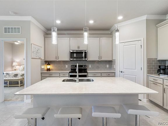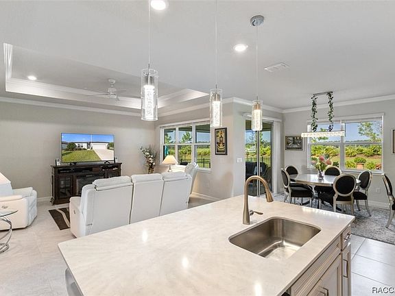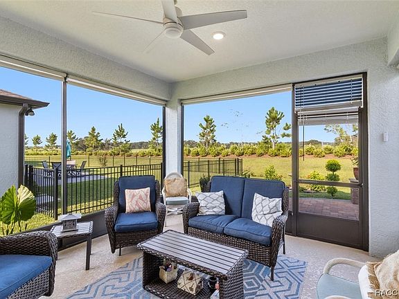 Well-equipped and tastefully decorated! This 2021 three bedroom, two bath home backs up to over 400 acres of pasture land for added privacy. The owners took advantage of it and built a beautiful brick paver back patio ideal for entertaining. This home has an open floor plan with a modern flare. Tray ceilings, crown molding and attention to detail can be seen throughout. There is tile in the main living area and carpeting in the bedrooms. Plenty of room for the chef in the family as well. Kitchen features beautiful white Silestone countertops, large center island, wood shaker soft close cabinets, stainless steel appliances and a large walk-in pantry. The roomy master bedroom features a walk-in closet large enough to be a room by itself! Beautiful master bath with a large walk-in shower, dual sinks and beautiful Silestone countertops. This home is truly turn key ready. Owners extended both the garage and back screened in lanai for added comfort. Additionally they epoxied the garage floor for added protection. This home is within walking distance to the dog park, pool, clubhouse, pickle ball courts and more. If you are looking for an all inclusive community and love to golf, this home is ready to go!