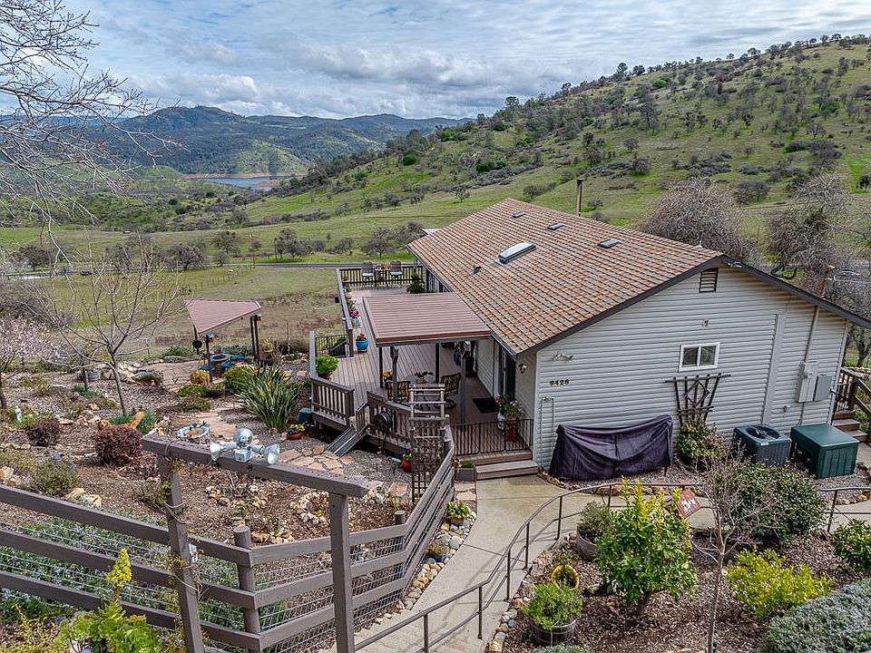 Spectacular Views! Come and explore this beautiful home with gorgeous views of Lake McClure & the Mountains! You will fall in love with the lovely setting, and garden area. Pergola & Fire pit for enjoying your morning or evening beverage. Ample area below for horses, or build a shop. Large composite deck, Metal garage is 2 car deep w/cement floor, roll up & man door. Large fenced in areas for furry friends. Enter this comfortable abode thru the sliding glass door, you can see the views thru the living room window as you enjoy your cozy wood stove. The kitchen features newer granite counters, paint, flooring, & appliance. There is a granite topped desk/office space & its bright and cheery! Down the hallway there are many cabinets for storage, even a laundry shoot that drops just above the washing machine! Guest bath has a soaking tub & shower combo, & marble floor. Spacious primary bedroom w/slider to deck & walk in closet. Bath with electric towel warmer, tile floor, ceramic & stone shower. venture downstairs to the large guest suite, plenty of closet space & extra storage, new floors. Bath w/shower & granite counter & new flooring, laundry room w/cabinets, slider door to yard. Whole house generator, central heat/AC. So close to Lake McClure entrance & an easy commute!