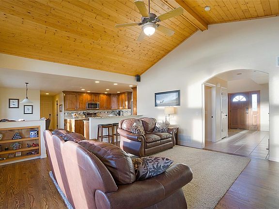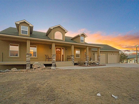 Welcome to a land where the breeze is fresher, the Colorado skies more blue, while breathtaking Pikes Peak commands the skyline with views up and down the front range. Slow down and enjoy the quiet life - this private and gated 37-acre ranch features all the amenities you'd need to make rural and equestrian life easy. Enjoy a completely updated residence, a fully equipped 6-stall barn, outdoor arena, four pastures, and a shop with enough space for 12 cars. As an added bonus, extra secured water rights convey with the property. Impeccably presented, take advantage of the kitchen highlighted by knotty alder custom cabinetry, granite counters, a walk-in pantry, and stainless-steel appliances. Natural light cascades into the great room, thanks to the oversized picture windows. Nestled beneath a 12" knotty pine, tongue-and-groove ceiling, the room is warmed by the stone gas fireplace. Opening to the full-length covered deck, here, you can soak up the spectacular views while the sun sets over the front range. A walk-out rec room on the lower-level is equally cozy and bright, with a wood-burning stove, ample space for relaxation, and even a kitchenette. The lower concrete patio with room for multiple sitting areas is a great space for entertaining! The master suite is accompanied by a walk-out deck and a sophisticated 5-piece bath with barn door entry, granite vanity, soaking tub, and walk-in closet. Your horses will live in style too from the 6-stall barn with electricity, tack room, hay storage, water hydrant for washing, mats up and down the alley, a separate corral, and a 111' x 120' outdoor arena. With four pastures, the property is fenced and cross fenced with multiple gates for easy access. A 2-car attached garage offers storage for your everyday vehicles while the 50'x80' ClearSpan® shop offers additional room for RVs or tractors and features cement floors, 220V power, water, and an overside garage door.