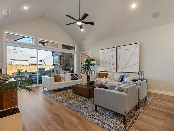 This designer owned home is a true showstopper-- where elevated finishes, thoughtful upgrades, and seamless indoor outdoor living come together in one exceptional open and highly sought after floor plan. From the moment you arrive, curb appeal sets the tone with upgraded garage doors featuring a diamond patters, oversized iron lanterns, wood shutters, stone-edged landscaping, and dramatic evening landscape lighting. Inside, the home opens to a vaulted living room filled with natural light and anchored by an entertainer's dream kitchen. The heart of the home is the stunning kitchen, centered around an oversized 12-foot Calcutta quartz island with seating for six, custom wood detailing, woven designer pendants, iron cabinet pulls, undermount lighting, a walk-in pantry, and upgraded appliances--perfect for both everyday living and hosting. An iron statement light fixture defines the dining space, while surround sound throughout enhances the experience. Wall-to-wall 8-foot sliding doors extend the living space outdoors to an incredible covered patio featuring a gas fireplace, custom-built entertainment area with two stainless steel grills gas+charcoal, prep space with storage, a built-in beverage refrigerator, and a 65 inch outdoor TV with custom wood weather cover--all included. This backyard is built for year-round entertaining. The spacious open layout offers large bedrooms, upgraded tile, countertops, and framed mirrors in all bathrooms, plus upgraded lighting throughout. A game room and bonus room with double doors are thoughtfully positioned at the back of the home, creating an ideal setup for a mother-in-law suite, guest retreat, or private flex space. Additional highlights include a 3 car garage, upgraded bathroom finishes, and countless custom touches that reflect true designer ownership. This is more than a home-it's a lifestyle. A rare opportunity to own a meticulously curated property designed for comfort, entertaining, and effortless indoor outdoor living.