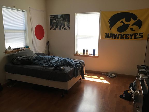 Duplex built in 2008, walking distance to downtown and campus. Wood and tile flooring, with off-street parking off of the alley in the back. Appliances include refrigerator, stove, microwave, disposal, dishwasher, clothes washer and dryer, hot water heater, furnace and central air unit. Three very large bedrooms, with spacious closets. Two bathrooms, one upstairs and one downstairs. Also includes kitchen area, large living room and a family room. Front porch facing the street. Three hallway closets. Less than a block to the bus stop. 360 day lease.