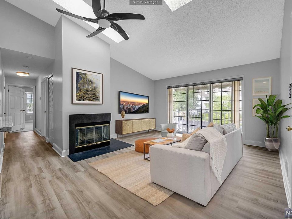 Flooded w/natural light, this west facing top floor corner unit condo in Mahwah's desirable Society Hill boasts newer luxury vinyl flooring in the living and dining rooms, newer carpet in the bedrooms, an updated open concept kitchen w/granite countertops & brand new stainless steel appliances, updated bathrooms, fireplace & vaulted ceilings. Completely repainted in 2022 from the new wider baseboard moldings to the ceiling. The primary bedroom has a large walk-in closet and full bathroom. Another bedroom and full bathroom, along with a large laundry room/storage closet are off the hallway, which also has new flooring. In a smaller building with only 12 units, this home has been well maintained and upgraded throughout ownership w/care & attention to detail. The pool & tennis courts are close by in the community & Society Hill is within close proximity to the Ramsey Rt. 17 train station for easy access to NYC. Mahwah is home to parks, hiking, skiing, and many sports fields.