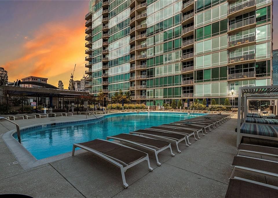 Enjoy living in this beautiful 2 bed 2 bath condo with stunning pool views. As you step inside, you'll notice the new bamboo flooring that has been installed throughout the entire unit. The upgraded kitchen boasts newer black stainless appliances, quartz counters, professionally painted cabinets, and a large farmers sink - perfect for cooking delicious meals and entertaining guests. You'll also love the convenience of having a newer washer and dryer included, saving you time and money. This unit comes with 2 prime parking spaces, 24 hour concierge, saltwater pool, full gym and club house. Located near many of Atlanta's top attractions, including the High Museum, Piedmont Park, and the Fox Theatre, you'll have plenty of options for entertainment and leisure. Don't miss out on the opportunity to make this luxurious condo your new home!