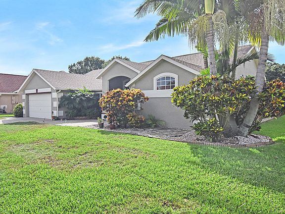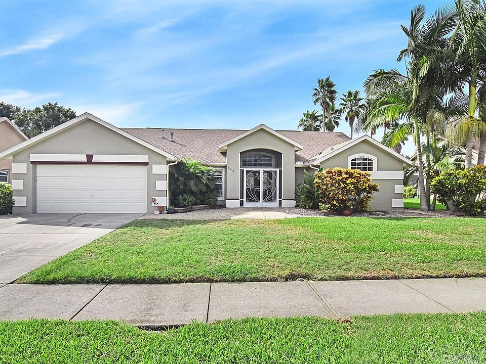 Popular Key West floor plan with high ceilings, large open kitchen and family room, stunning master bath with cherry cabinets, quartz countertops, and walk-in shower. Tropical resort style pool includes Travertine stones on deck and in beach entry area, pebble tech surface finish, oversized spa with river rock design, handcrafted custom river rock waterfalls, in-pool dining table, deck jet, water bubble and covered with oversized high end screen enclosure. All pool features are automated and operated via cell phone app. For added fun there is a Professional sized shuffleboard court right behind pool area. Exterior painted in 2015. Newer Trane AC, Gas stove & water heater, plus so much more. Hurry on over before this opportunity passes you by....