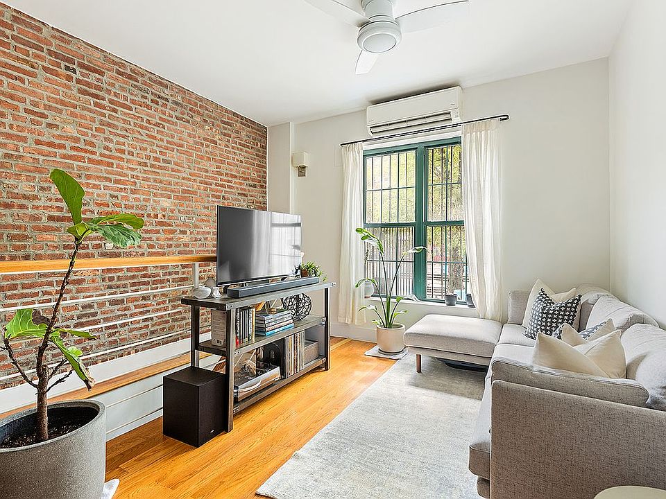 Modern one bedroom duplex with large rec room and 1 1/2 bathrooms plus quaint outdoor space. Great design with modern details breathe new life into a classic Brooklyn townhouse with beautiful results. This cool one bedroom duplex with one and a half baths offers modern details and exposed brick. Beautiful white oak hardwood floors, tall entry doors and chrome hardware. Your take-out habit is sure to take a back burner to home cooking in a kitchen that features Fisher Paykel fridge, Summit electric stove and Frigidaire 18" wide dishwasher. The cabinets are black lacquer, the backsplash is white tile and the countertop stone. The bathroom offers a large soaking tub brings a spa-like feeling.On the lower level is a recreation room/lounge which can be used as a home office and den (20w x 10d) and leads to a quaint outdoor space.