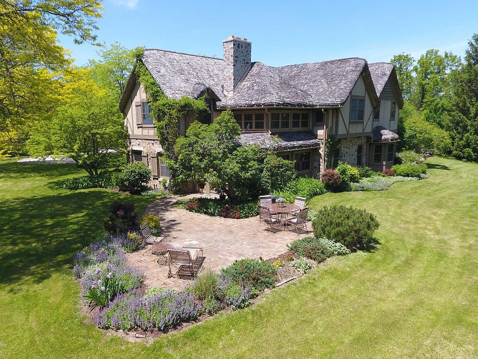 Only available for a 2nd time since its 1940 inception, this historic, English Country Tudor is set upon a serene setting w/ponds & an abundance of wildlife. Experience a harmony of design & detail, which is established throughout w/stone fireplaces, hand-hewn barn beams & thatched cedar roof. This elegant country home retains its original charm & comfortable character. Large gathering spaces & splendid views of the surrounding acreage offer the entertainer a sophisticated canvas to create any get together. Don't miss the first known motorcycle garage & this historic opportunity.