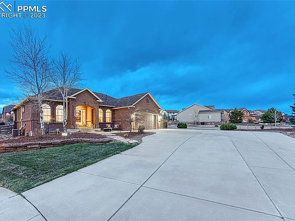 Welcome to this stunning 3,348 ranch-style home with 5 BD/3BA and a finished, oversized 2-car garage on a beautiful .42 acre cul-de-sac lot. Enter from the covered porch to a large receiving area, 9’ ceilings and natural light streaming in through large windows and illuminating the elegant hardwood floors. The main living area is open-concept with a great room, dining area, and eat-in kitchen seamlessly integrated to create a perfect space for entertaining or relaxing. The great room features a stone gas fireplace, ceiling fan and large windows. The kitchen boasts a 5-burner gas stove, stainless steel appliances, granite countertops, ample storage, a pantry and a counter bar. An adjoining breakfast nook features a bay of windows and a walk-out to the expansive patio and fully fenced, spacious backyard offering plenty of room for playing, lounging, eating and barbecuing. The dining area features hardwood floors, wainscoting and crown molding. The main level primary bedroom features an ensuite 5-piece bath, complete with a jetted tub, walk-in shower, walk-in closet with cedar perimeter and French door. Completing the main floor are an additional bedroom, a full bath and the laundry/mud room with a utility sink, cabinetry and garage access. Downstairs, also with 9’ ceilings, boasts a very large family room, 3 additional bedrooms, one with a walk-in closet and one with his/her closets, a full bath with double vanity and storage room (or 2nd laundry room) with built-in shelves. This home’s location in Academy School District 20 offers convenient access to several parks, the Powers corridor and Woodmen Rd.