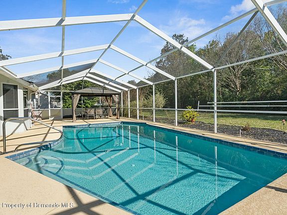 POOL AND PRIVACY!! This beautiful home offers 3 bedrooms + 2 bathrooms + 2-car garage + private pool with large covered lanai + nestled in the trees on this very private-feeling oversized lot (.67 acres)!! NO BUILD AREA to the right and a wooded rear lot line give you such a feeling of privacy!! The best part of this home is the location!! Right in the heart of Spring Hill, but you feel like you're away from it all!! NO HOA!! Home is NOT in a flood zone (Zone X). ROOF 2014. AC 2023. High ceilings with large glass sliders over-looking the pool make this home feel light, bright, and spacious!! Large home for your family and entertaining your friends at 2,134 sq ft living space; 2,970 sq ft total! The kitchen has been remodeled with stunning granite countertops and breakfast bar and white cabinets for that clean, bright look! Large breakfast nook overlooks the pool. Formal dining room for hosting those holidays! The large covered lanai gives you a great amount of outdoor living space for enjoying your morning coffee by the pool or hosting those pool parties with your family and friends! Outdoor kitchen area. Split floor plan gives privacy to the master suite which has dual walk-in closets, dual vanities/sinks, soaking tub, and separate walk-in shower! The second and third bedrooms are large, one has a large walk-in closet! Inside, large laundry room! Located 10 minutes from the Suncoast Parkway for quick and easy access to Tampa for work and play! 15 minutes to kayaking the clear Weeki Wachee River, swimming with the manatees, or watching the sunsets at Pine Island!! Tampa General Hospital Spring Hill is just only minutes away. Zoned for Springstead High School. Call to come see this one today!