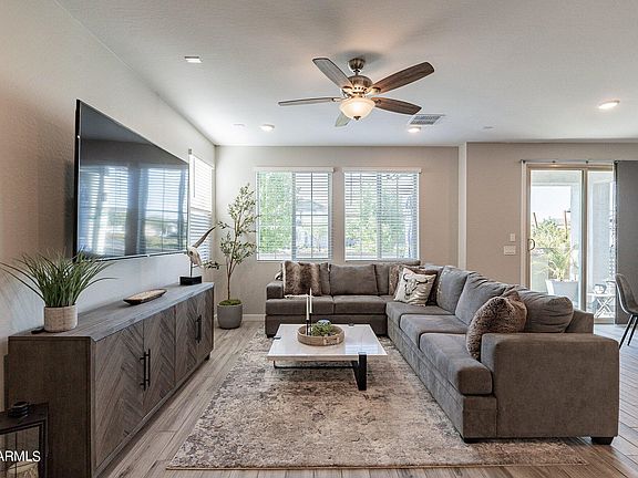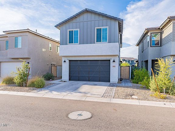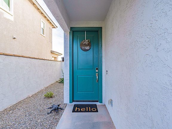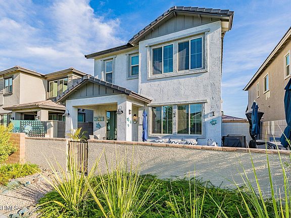 Welcome to your dream home, where modern luxury meets timeless charm. This brand new 2023 masterpiece boasts a farm-style exterior that exudes curb appeal, set against a backdrop of lush greenery. As you approach, a private walkway guides you to the front door, unveiling a residence designed with meticulous attention to detail. Inside, you'll find 4 spacious bedrooms, 2.5 elegantly appointed bathrooms, and a versatile loft space perfect for a home office, hosting movie night, a teen retreat, or play area. The interior is bathed in natural light, with 9+ ft ceilings enhancing the sense of space. Fresh baseboards and neutral paint provide a crisp, clean palette, while porcelain plank wood-look tile flooring adds warmth and durability with pre-wired surround sound. The heart of the home is the gourmet kitchen, featuring shaker cabinetry, gas cooktop, stunning granite countertops, an oversized island, pre-wired pendant lighting, and stainless steel appliances, all anchored by a farmhouse sink. The walk-in pantry offers ample storage, while under-stair storage and a convenient downstairs half bath ensure every need is met along with pre-wired surround sound in the great room. The owner's suite is a true retreat, with a welcoming beverage bar just outside the room, dual vanities, a walk-in shower, private toilet room, and a walk-in closet that connects directly to the laundry room for ultimate convenience. The backyard is a custom entertainer's delight with a built in gas stub, matching grey pavers leading from the extended garage slab parking to the artificial turf, providing year-round greenery. Enjoy direct access to a well manicured green belt/ biking and walking path through your private entrance, or relax on the covered patio. Living in Eastmark means access to a wealth of amenities, from the splash pad and clubhouse to multiple parks, a catch & release fishing lake, skate parks, BBQ grills, sports courts, fitness center, ample community clubs, local restaurants, a cozy coffee shop, and a vibrant community garden at Steadfast Farm. This home is not just a place to live, but a lifestyle to embrace in a community built on connections and creativity. Come say hello to your new home sweet home!