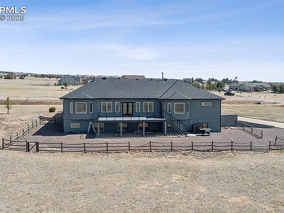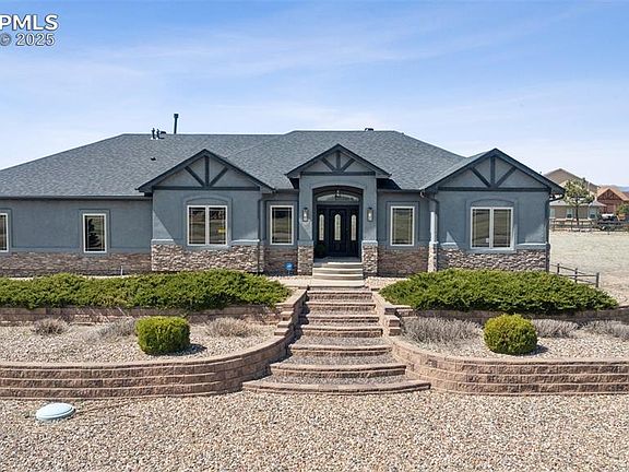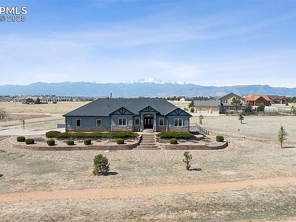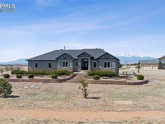 This beautiful home, situated on 2.71 acres, offers breathtaking views of Pikes Peak and the Front Range, combining luxury, comfort, and a functional layout. The property’s prime location offers peace and tranquility while being conveniently close to St. Francis Hospital, dining, shopping, and entertainment. Upon entering, you’ll immediately notice the seamless blend of style and practicality, with natural hardwood floors throughout. The inviting foyer leads you to the left, where you’ll find a versatile bedroom/office, and to the right, the first of two junior suites. Continuing straight ahead, the spacious living room and kitchen greet you. The living room, with its vaulted cathedral ceiling and sleek black accent wall around the gas fireplace, creates a warm and inviting atmosphere. Just beyond, the kitchen is a chef’s dream, featuring dual ovens, a walk-in pantry, a glass cooktop, an island sink, and clean white cabinetry paired with black countertops and accents. A breakfast bar separates the kitchen from the living area, making it perfect for both cooking and entertaining. Past the living room is the second junior suite. Like the first, this offers a walk-in closet and private bathroom. The main level also includes a serene primary suite that serves as a true retreat. It boasts a huge 13.7x7.11 walk-in closet, a luxurious upgraded 5-piece bath, a sitting area, and direct access to the enclosed deck, where you can enjoy the tranquil views of the surrounding meadows and Pikes Peak. The unfinished garden-level basement offers ample space and endless possibilities for customization, with rough-ins for two additional bathrooms, providing great potential for future expansion. The home is complete with a 5-bedroom-rated septic system ready for your finishing touches. With its expansive acreage, stunning mountain views, and high-end features, this home is a rare find in an ideal location!
