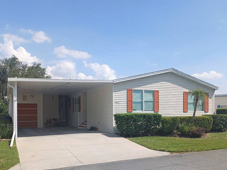 You will love the additional 20 x 20 Four-Seasons room overlooking water and woods in this 1994 Palm Harbor home. The original 1568 sq. ft. of living space has 3 bedrooms, 2 baths and an open floorplan great for entertaining. The kitchen has fully tiled backsplash, a great deal of storage and an island. It features both a dining room as well as an eat-in kitchen. There are plantation shutters in the living and dining areas. The faux fireplace with great mantel are a focal point in the living room, as well as the horizon windows that let in great light. The master is very spacious and the bathroom has an updated shower and counters. The separate laundry room has additional storage. The original lanai was enlarged and made into a great family room with large windows to appreciate the great view. Step outback to the rear patio to enjoy the garden area with more storage. The shed is double in size with a roll-up door and includes the golf cart! The roof is architectural shingles. Both the A/C and roof have been maintained on a regular basis. Call the Sales & Information Center for more details.