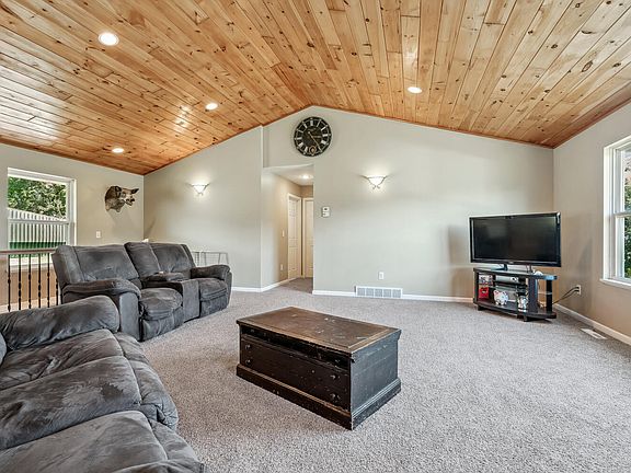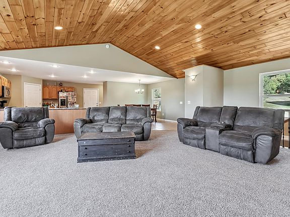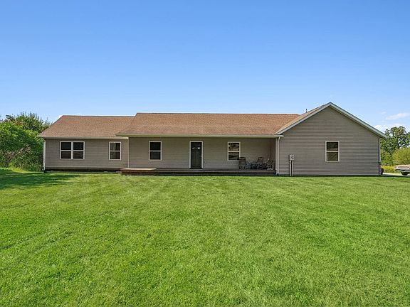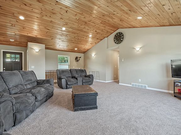 Discover the perfect blend of country charm and modern comfort with this stunning ranch on 4.8 acres w/ spring fed pond. Features vaulted ceilings & a cedar-paneled living room that adds a touch of rustic elegance. The open kitchen, equipped w/ SS appliances & pantry, is ideal for both casual meals & gourmet cooking. Main floor primary bedroom offers ample closet space and a large en suite. Lower level is finished with four bedrooms and a full bath. Outside, you'll find two massive outbuildings. One is 40 x 80 with 60 feet heated, a half bath and large upper loft space already equipped with a pool table. These outbuildings offer ample space for storage, workshops, or hobbies. Having a 16x32 woodshed makes wood storage easy.