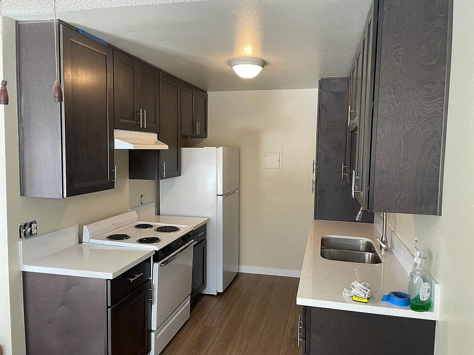 1 Bedroom, 1 bath apartment for rent. This unit has been completely refurbished, with new cabinets flooring, texture, paint shower enclosure. This Apartment complex offers covered and gated parking, additional storage 2 pools with BBQ areas, on site laundry. Close to shopping, schools and freeway. Owner pays for water and trash, Tenant is responsible for electric..