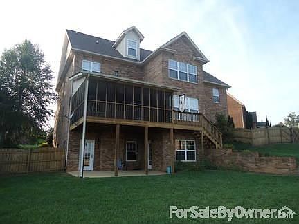 LOCATED AT THE END OF A PRIVATE CUL-DE-SAC (with a neighborhood community pool) 5 Bedrooms and 4 1/2 baths with 2 bonus rooms Full unfinished walkout basement that is plumbed with another full bath (approx 1200 addional square feet of space to add to home once finished) 3 Car Attached side entry garage with flat concrete driveway Large Lot with privacy fence (includes a 3 level children playset). Also Big enough to add detached garage or a pool. Screened in back patio that overlooks Smokey Mountains and at night the city lights The Top level of this home has been professionally remodeled to include a bedroom, full bath, and rec/ bonus room Master Bedroom has separate his/her walk in closets with master bath (jacuzzi tub, sep shower, toilet room, and double cherry vanity) All Baths have tile flooring, Crown molding thru out the entire home, all cabinetry thru outh home is cherry Custom wooden blinds thru out, plumbed for central vac Family room with fireplace Hardwood flooring on the main Lawn irriagation system Cherry Kitchen with tile flooring, stainless steal app, bar, and nook Will Entertain Agents 12 Minutes from Downtown... minutes away from Turkey Creek Additional property info: http://www.forsalebyowner.com/listing/A087C?provider_id=28079