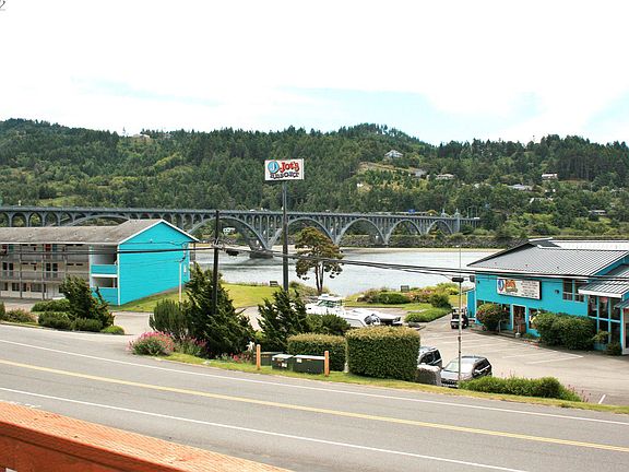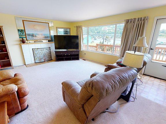 Views of the Rogue River Bay and famous Patterson Bridge from this 3 bedroom 2 and a half bath home. All living on the main level. Garage, laundry, storage and workshop or hobby area below. Elevator from lower to upper living area is a huge plus. Newer garage doors, HVAC, windows, refrigerator and dishwasher. Fenced landscaped back yard with a deck & dog kennel. Zoned commercial, this beauty has exceptional potential for a vacation rental.