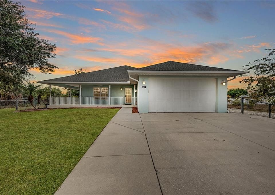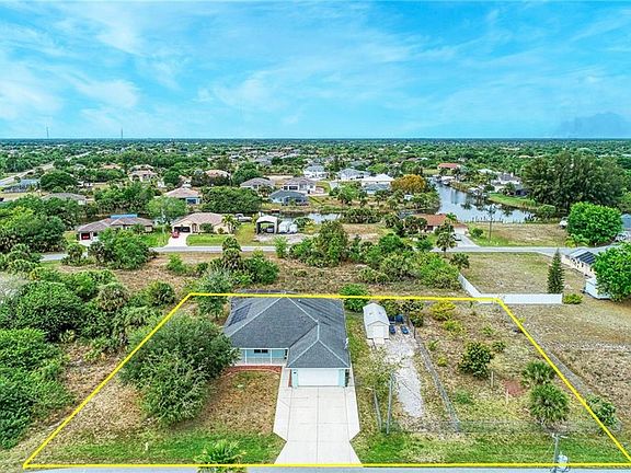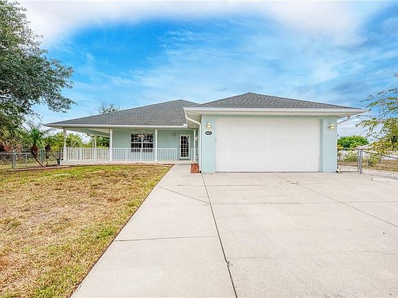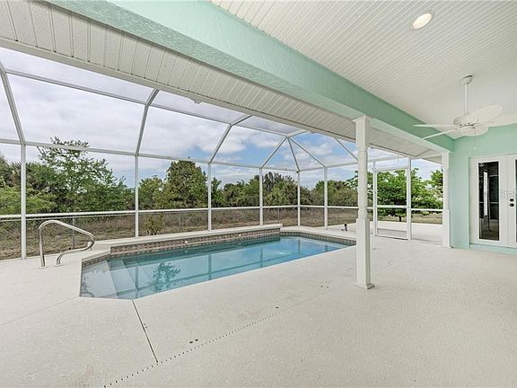 **MULTIPLE OFFERS**. H & B by 4pm 3/27/21. Clean, freshly painted 3 bed 2.5 bath POOL home on a fenced double lot in South Gulf Cove! Who hasn't ever wanted a cute wrap-around porch?? A rarity in this area! The open floor-plan main living area highlights a functional, spacious kitchen featuring a massive breakfast bar with space for 9-10 stools. Light pours in from french doors out to the porch. The master suite offers french doors to the lanai and a large walk-in closet, his/her vanity in the bath, soaking tub and spacious walk-in shower. Bedrooms 2 and 3 have a shared bath, plus an additional 1/2 bath. The pool is solar heated for those winter days and is a perfect way to cool off with a beverage after a day on the boat or golf course. The recently coated garage has it's own mini split AC so you can tinker without the sweat. Additional features include: impact doors & windows, instant hot water in the kitchen and under-sink drinking water filtration, irrigation system (on it's own well), massive 25x10 shed/workshop with electric, fenced boat/rv parking with water & electric, many mature fruit trees, additional concrete patio adjacent to the pool perfect for sunbathing or a hot tub! Charlotte County has installed 17+- miles of walking/bike paths throughout the community. Perfect location near beaches, shopping, dining, airports, over 200 holes of golf and world class fishing within minutes from your front door.