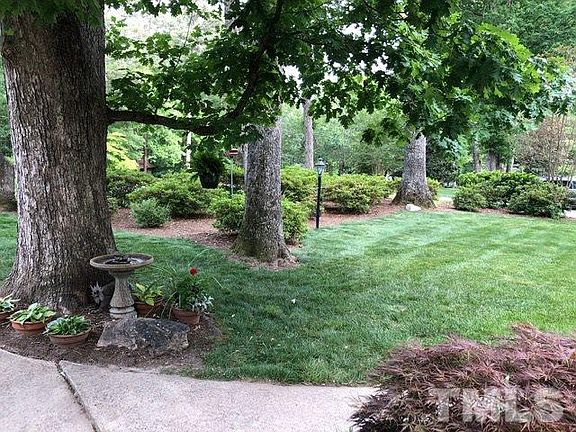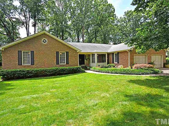 Great location! Close to 540, RTP, 4 major malls & Leesville school district. 4 bdrm, 3 full baths, custom built 2683 sq ft all brick ranch on .58 acre landscaped lot. Great rm has wood beamed cathedral ceiling, 2 skylights, B/I bookshelves, flr to ceiling real FP/gas logs. Sep dining rm & brkfst rm w/bay window overlooking fish pond/waterfall & flower garden. Large family rm w/WIC & French drs to huge 12'x65' deck overlooking big bckyrd w/hardwds & dogwds. 2 car attached gar w/workbench & B/I storage!