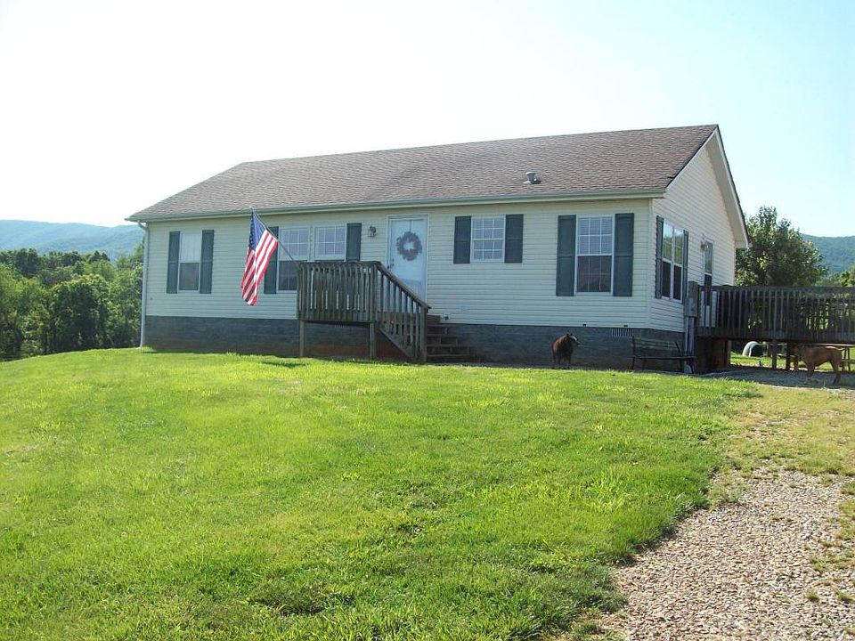 WOW, the views! 3BR, 2BA ranch. Beautiful oak cabinets, eat-in kitchen, ceramic backsplash, dishwasher, built-in microwave. Split bedroom plan, master w/ walk-in closet. Oak laminate floors thruout. Great room offers cathedral ceiling & lots of windows to view the mountains. Bring the horses, cows, goats, pigs, & chickens to your private 20 acre mini farm. Located near National Forest, riding trails, & minutes from James River boat launch. 20x20 barn has lights, power, & water. Pond & stream on fenced & cross fenced property. 24x30 detached garage/workshop, lights, power, water, concrete floor, flue for wood stove. Separate carport. Lots of road frontage, possible additional house site. Gentlemen, cowboys, cowgirls, & nature lovers, this is the home of you!