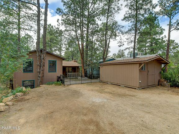 Nestled in the quiet streets of the Mountain club you will find this 3 bd 2 ba 1730 sq ft home. Live in the pines near the edge of the National forest yet just a mile to downtown. Property boasts ample parking and a private fenced front courtyard with a covered porch. Step inside to an open concept beamed great room with vaulted ceiling and wood burning fireplace. Enjoy cooking in the fresh and bright kitchen including white cabinets, SS appliances, chopping block counters, and subway backsplash. Real wood floors in the kitchen and AZ room. Lower level offers separate family room and laundry.