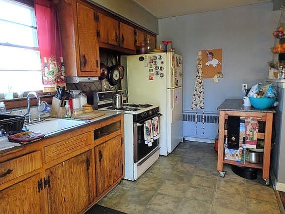 Chance to own a 2 Family to live in and collect rent or fully rent. Property has separate utilities- 2 gas furnaces, newer Hot Water tanks, separate electric panels and gas. Each apt offers open Living Room, Dining Room and Kitchen; 2 bedrooms and full Bath. 1st level apartment has walkout to back and access to partially finished basement with rec rm, utility & laundry area. 2nd level apartment has updated white Kitchn cabinets and Walk In Closet in Master Bedroom. Long driveway leads to oversized 2 car detached garage with electric. Home Sold strictly "AS IS". Needs exterior and interior improvements.