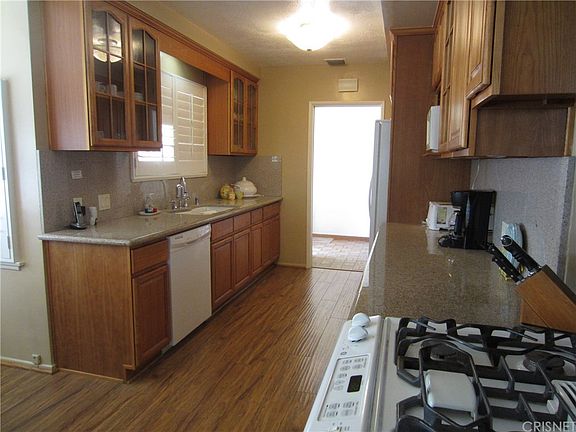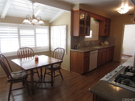 Lovely Ranch style home in the desireable Cove neighborhood in Northridge. 3 spacious bedrooms, large living room with fireplace and a den with fireplace. The remodeled kitchen has gas appliances, dishwasher, granite counters, custom cabinets and a breakfast area. Laundry room includes washer and dryer. Original hardwood floors throughout, no carpets! Beautiful private back yard has a covered patio, flower gardens and a terrific swimming pool! Huge attached 2 car garage with auto opener and roll up door. Close to schools, shopping, CSUN. Easy freeway access. Pool service and gardener included.
