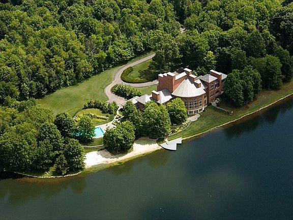 This magnificent twenty-three acre estate sits peacefully tucked away on Lords Lake. After entering the gated property, you will wind down a half-mile private drive to a 24,000 square foot modern day mansion. This estate exudes a classic elegance, designed with custom stones and intricate brick work as well as a stunning slate roof. Custom hand cut blue stone walkways lead to seven unique patios, an in-ground hot tub and a 65,000 gallon cement bottom swimming pool . There is also a private beach and sand volleyball court. Both the exterior and the interior spaces are integrated seamlessly. Upon entering the estate, you will notice the beautiful mosaic design of the heated foyer floors, made from hand-cut granite and slate. The massive forty foot ceiling structures are designed with back lit exposed beams. The open glass three-story staircase leading to the great room is reminiscent of a story book charm. A Romeo and Juliet balcony overlooks an 1800 square-foot great room. If you look up at the 30-foot ceilings, you’ll notice massive back lit crown with a custom painting of the night sky. The great room features a 20-foot granite fireplace and holds quite the view with its 25-foot windows overlooking the lake. There are 8 total fireplaces throughout the home. Each fireplace is unique in its design and rich in stone, marble, granite, or black walnut. The dining room has intricate black walnut trayed ceilings and a built in buffet equipped with a butlers pantry. The home contains 8 bedrooms and 14 bathrooms. There is a private phone booth trimmed in brass studs and lined with soft suede walls. Stain glass art is throughout the foyer, master bedroom, bathrooms and phone booth. The Master bedroom with its 30-foot ceilings and 30-foot glass windows holds the romantic view of sunsets over the water. The master bath also has custom mirrored cabinetry and 14-foot mirrored walls. The home also has a complete library with extremely rare wormy chestnut cabinetry and book shelves. The library features a chestnut ceiling and stunning chevon flooring. The library conjoining conference room has a private second floor outdoor patio. The kitchen boasts of hand honed wooden beams across the ceiling and custom hand made Schrock cabinetry. On the lower level you will find a complete arcade, theater area and a full-size commercial type workout room with a built in television and a state of the art sound system. On the lower level, you will also find the maids quarters, complete with a full kitchen, living room, bathroom, bedroom and private patio. There is a separate 3,000 square-foot storage garage on the property complete with a 1,000 square-foot grounds keepers studio apartment . The estate was showcased on MTV Cribs in March 2009. It sold for $2,650,000 in 2007. There has been over $1,000,000 in renovations since.