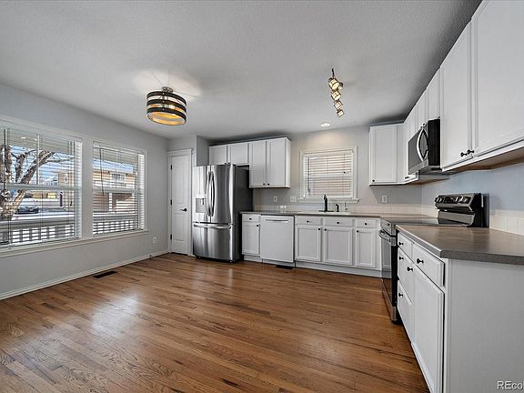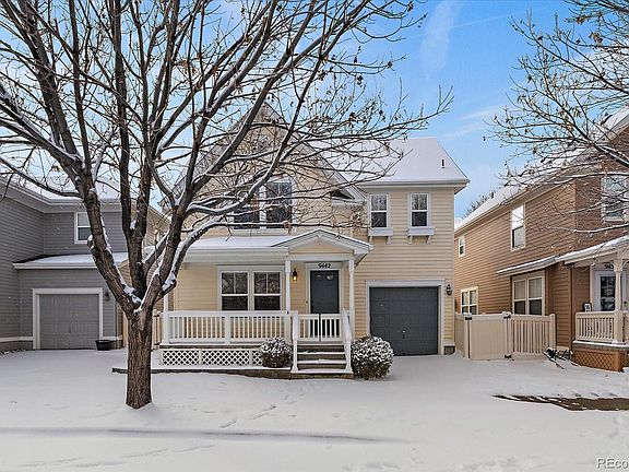 Charming Belle Creek Gem! This move-in-ready 3-bedroom 2 bathroom home features a brand new roof and solar panels for energy efficiency. Updated bathrooms add a modern touch throughout. Relax on the inviting front porch or host summer barbecues on the back patio. The eat-in kitchen boasts hardwood floors and a bright, cheerful vibe. Upstairs, discover a spacious primary suite with a walk-in closet and a beautifully updated en-suite bath. The secondary bath impresses with granite countertops, dual vanities, serving two additional bedrooms. A full, unfinished basement offers endless potential for customization. Neighborhood highlights include a Charter School, Belle Creek Family Center-YMCA, a Community Garden, and an easy commute to Denver, DIA, or Boulder. Don't miss this delightful home—schedule your tour today!