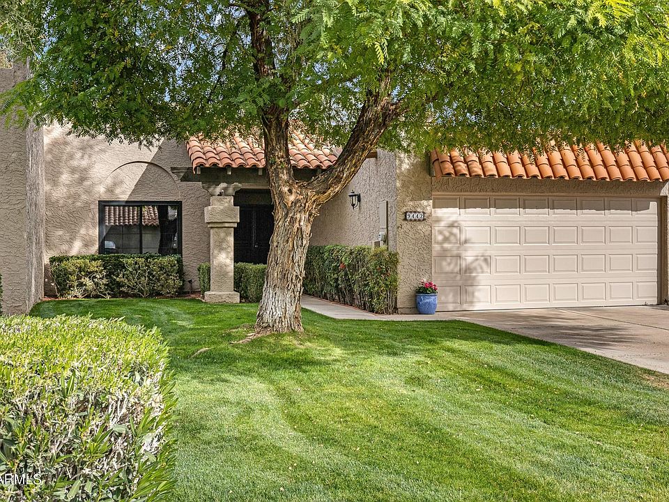 Located in the sought-after Scottsdale Vista Townhomes, this exceptional 3-bedroom, 2-bathroom property is on one of the best lots in the community, backing to lush green space and steps from the pool. Nestled on a quiet cul-de-sac, the home boasts mountain views and is just one block from the Greenbelt. The private yard features mature landscaping, a spacious patio, and a cozy seating area—perfect for enjoying Arizona's weather. The lush grass front yard is beautifully maintained by the HOA, adding to the home's charm. Inside, the home features real wood flooring, soaring 16-foot vaulted ceilings, and an abundance of natural light. The expansive kitchen offers stainless steel appliances, ample seating, and an eat-in area. The open layout includes a large living room, a family room with a built-in entertainment center, and double doors leading to the serene backyard.