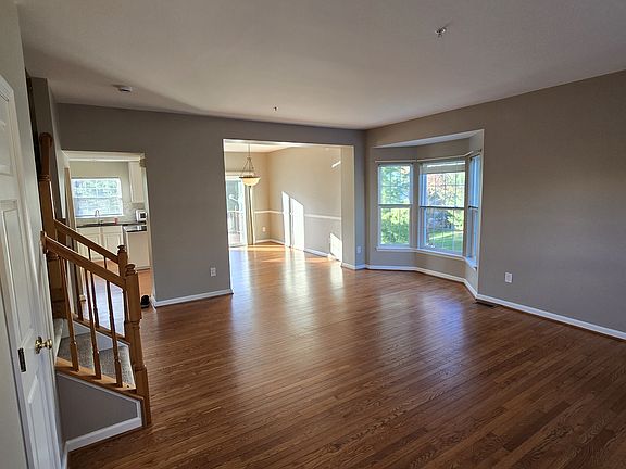 Hardwood flooring on first level throughout with open floor plan. Large eat-in kitchen with center island, granite countertops, vented hood, stainless steel appliances and gas stove. Dining area leads to large rear deck overlooking private wooded common area.