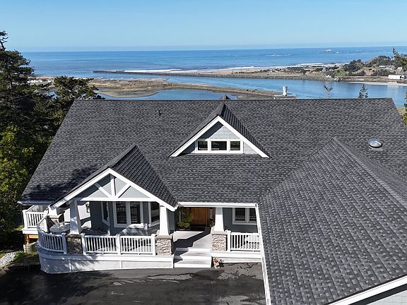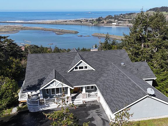 This custom-built 3 bed 2 1/2 bath home offers spectacular panoramic views of the Pacific Ocean, the Rogue River, Rogue River Bay, both jetties, and Rogue Reef. Designed specifically for the site, it features high-end finishes and quality throughout. Enjoy cozy evenings by any of the two fireplaces and take advantage of the wrap-around deck, perfect for soaking up the sun, watching sunsets, and enjoying quiet mornings with coffee while observing the activity in the bay—there are views from almost every room. The home boasts beautiful hardwood maple flooring, granite countertops, vaulted ceilings, Anderson clad wood windows, and elegant French doors. The primary bedroom suite is conveniently located on the main level, alongside the kitchen, dining, and living areas, as well as a guest bath. The lower level includes guest quarters with two bedrooms and a bath, office space and a wine cellar.