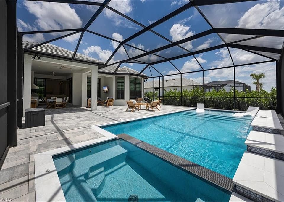 "Live Life Beautifully in Southwest Florida" and welcome to your dream retreat in the brand-new community of Caymas where luxury living, open-concept design, and an unbeatable location converge. This beautifully crafted 3-bedroom + den, 3-bathroom home seamlessly blends sleek, modern finishes with warm, inviting contemporary furnishings, creating the perfect balance of sophistication and comfort. Step inside to soaring cathedral ceilings and an expansive living space that flows effortlessly into a gourmet kitchen and stylish lounge areas. The flexible den provides the perfect spot for a home office, media room, or guest quarters. The true showstopper lies outdoors. Your private extended lanai is a resort-style haven, complete with a sparkling pool and spa & southern exposure, plus a fully equipped outdoor kitchen featuring a gas grill, refrigerator, and sink ideal for entertaining or relaxing under the Florida sun. With generous space both inside and out, this home was designed for effortless indoor-outdoor living. Caymas offers the rare combination of tranquil community charm and prime convenience just 15 minutes to Marco Island and 20 minutes to downtown Naples, where you can explore sugar-sand beaches, top-rated dining, boutique shopping, and world-class boating. Marco Island, in particular, is celebrated for its vibrant boating lifestyle, making this home a perfect fit for those who want to enjoy everything Southwest Florida has to offer.