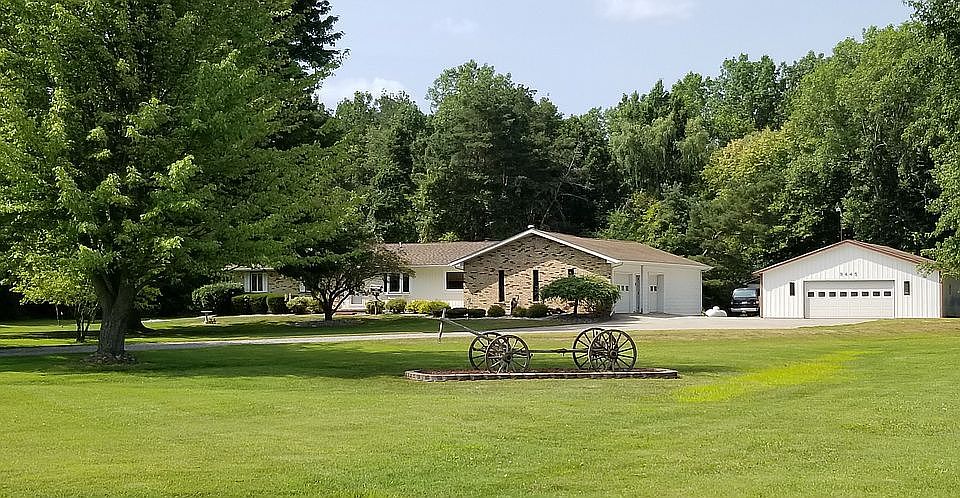 Beautiful custom build home on 10 acres! Sit on your deck and watch the wildlife or just relax and enjoy the peaceful country setting. This home has several unique features: professional landscaping, hand cut marble fireplace, new flooring, updated kitchen, heated and insulated 32x40 shop, 24x28 pole barn, attached 2 car garage, and an additional lean to for storage. Move in ready with 2,696 square feet of living space and 9 rooms and includes bonus/recreation room.